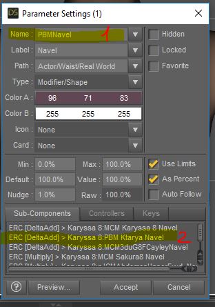Du kannst aber unter "Currently Used" alle Morphs sehen, die Du für den Chara genutzt hast, auch die, die Du Dir evtl. in Z-Brush o. ä. selbst erstellst. Jetzt einfach einen Morph anklicken über das "Rad-Icon" (siehe Screen 01). Jetzt öffnen sich die Parameter Settings. Hier siehst Du unter "Name" den Namen des Morphs und ganz unten erkennst Du zu welcher Figur der Name gehört (siehe Screen 2).