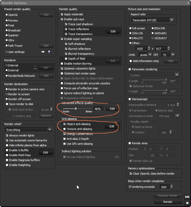 Die von Vue vorgegebenen Rendermöglichkeiten Final und Ultra benutze ich überhaupt nicht, weil sie zu lange dauern. Stattdessen habe ich meine eigenen Rendereinstellungen, die ich meist nur im Format (Widescreen Panavision etc), der Rendergrösse und manchmal auch - wenn es notwenig ist , in der Advanced Effects Quality oder dem Antialiasing anpasse. Ich habe hier mal die Einstellungen als Screenshot und auch direkt als Rendereinstellungsdatei angefügt. Die Rendereinstellungsdatei (im zip) kann man im entsprechenden Verzeichnis in Vue speichern. ( C: \program files\e-onsoftware\Vue....\Environment ) und es dann imn den Renderoptionen unter dem Pfeil rechts neben den Usersettings laden.