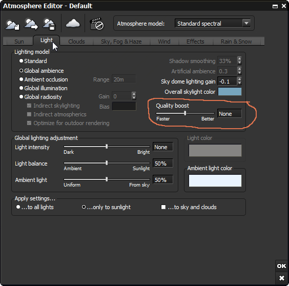 Nun zu den Atmosphereneinstellungen am Beispiel der Standard spektralen Atmosphere: Im Atmosphereneditor unter derm Licht-Reiter sieht man die verschiedenen Möglichkeiten, die ein Atmosphere haben kann nur schon von der Bleuchtung her. Die Beleuchtung hat generelle Einstellungen (standard, global ambience, ambient occlusion, global illumination und global radiosity) Die letztere global Radiosity ist diejenige , die ich immer für Aussenrender verwende. aber einfach mal ausprobieren, was wie wirkt. Bei den Schatteneinstellungen, insbesondere dem Smoothing der Schatten, kann man zum Beispiel die Schattenschärfe verändern. Der Qualitätsbooster sollte man nur dann anfassen, wenn es wirklich alls buchreif aussehen muss, weil er die Renderzeiten erheblich verlängert. Mit dem darunterliegenden Einstellungen insbesondere der ambienten Beleuchtung und der LIchtquelle Sonnenlicht kann man eine mehr diesige oder mehr sonnige, schattenreiche Einstellung der Atmosphere vornehmen. Auch die Farbe der ambience Lichtes hat einen erheblichen Einfluss einfach mal spielen damit.