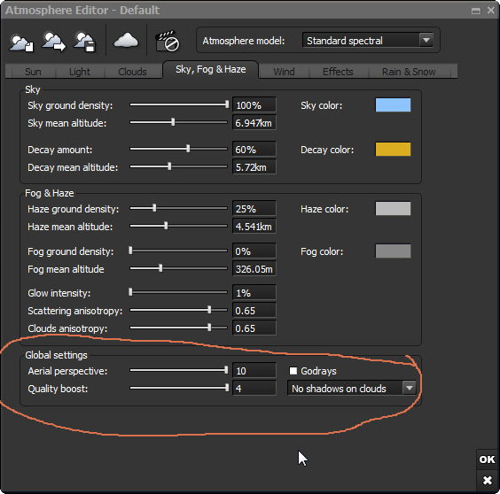 Den Wolkentab lass ich hier weg, der ist ein anderes Kapitel. Im Reiter Sky, Fog und Haze gibt es nebst einigen Einstellungen ebenfalls mal zum Spielen weitere Qualitätseinstellungen in den gLobalen Einstellungen ganz unten. Die Luft- Perspektive regelt die Klarheit oder Dunstigkeit einer Atmosphere. Werte um 1 zeigen alles sehr klar, werte um die 100 alles ausgesprochen nebelig.