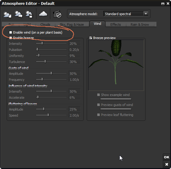 Was man zur Verkürzung der Renderzeiten nicht mitrendern lassen sollte, wenn man es nicht braucht, sind die Windeinstellungen im nächsten Tab.