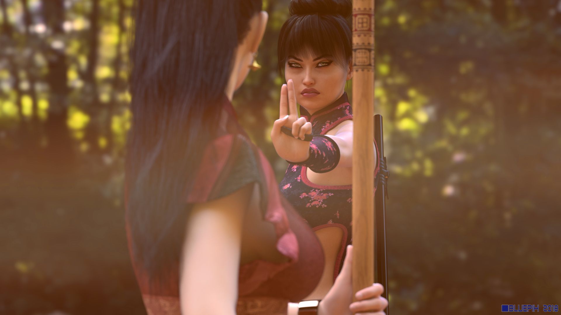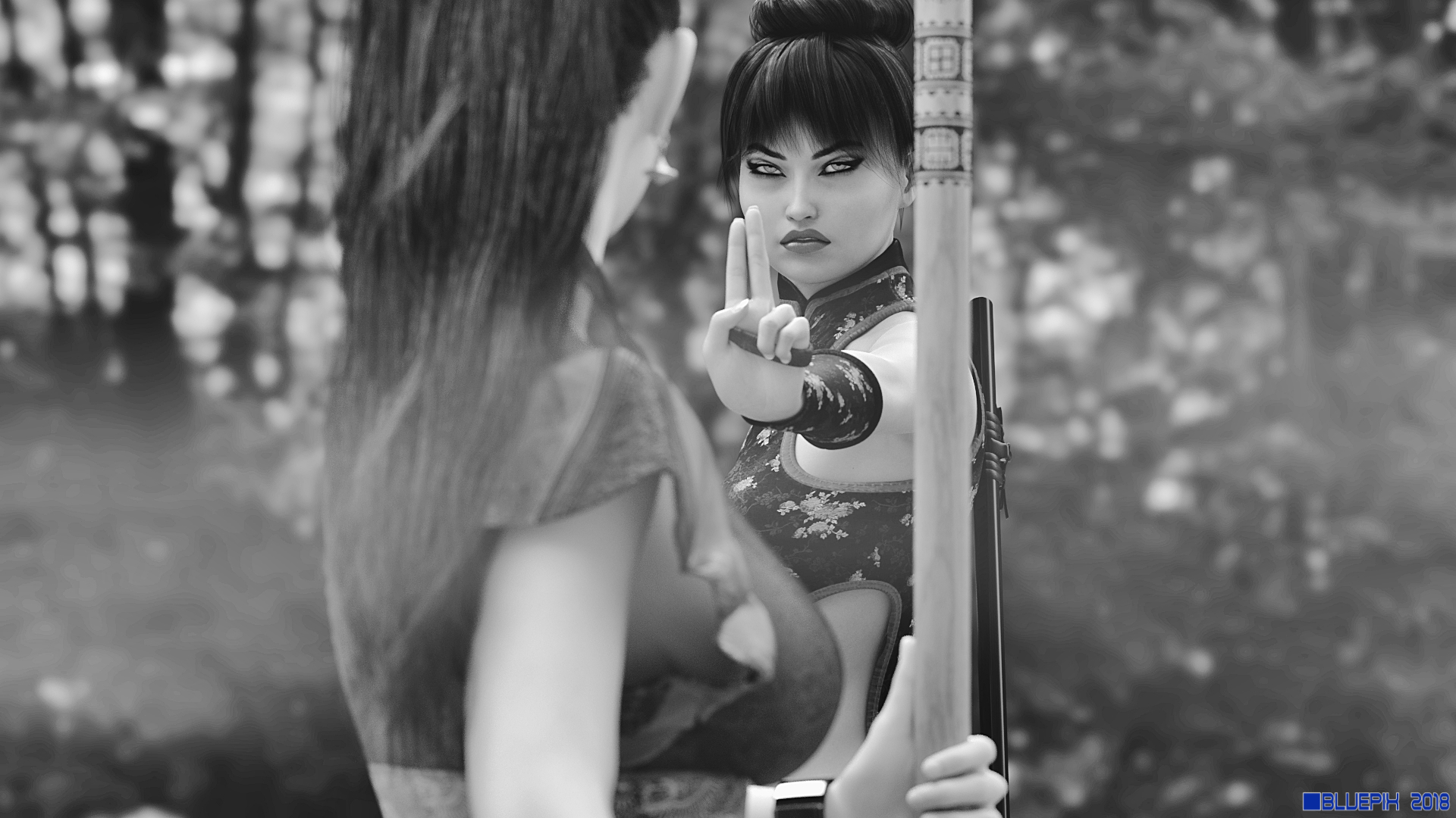 Die Stab-halt-Hand(pose) der vorderen Dame wirkt auf mich etwas unnatürlich. Fällt mir hier auf, weil an der unteren Bildkante schon sehr im Fokus. Glaub' so hält niemand, der 'auf-dem-Sprung' ist, um schnell reagieren zu können, eine Waffe. (Liegt aber wahrscheinlich auch mit an der Genesis2 Handgeometrie.) Würde wahrscheinlich versuchen, dies dadurch etwas zu 'kaschieren', indem ich die Kamera einen-Finger-breit höher(an)setze. (Also schon wie hier, nur eben bereits am Mittelfinger cut-en.)