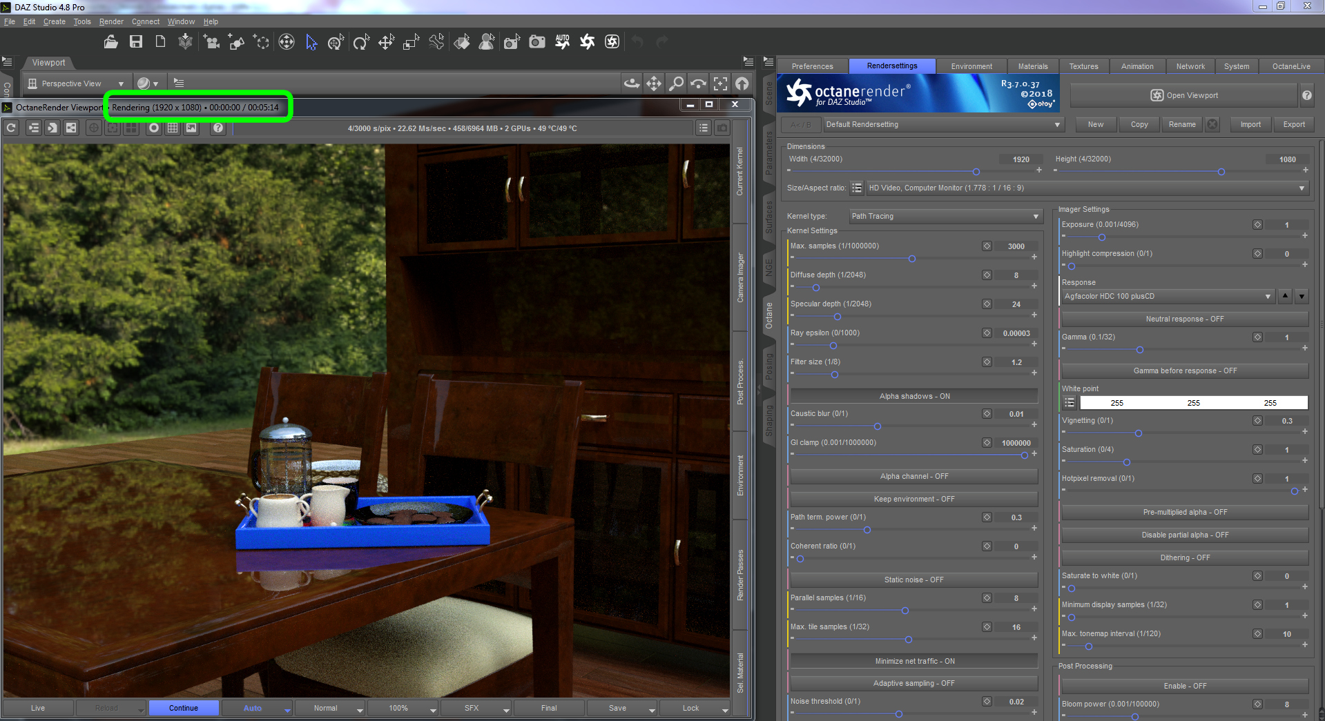 Mit Realtime beim PB Rendering ist - meiner Meinung nach - gemeint, dass, nicht wie bei iRay, die Engine erst mal Sekunden braucht um überhaupt etwas zu zeigen. Hier ein Octane Beispiel. Siehe Renderzeit Voranzeige für das fertige Bild (bei 3000 Sampels) und aktulle Renderzeit (0 Sekunden!). Logischerweise ist das Bild noch minimal verschneit, weil erst 2 Samples in 0,...irgendwas Sekunden durch sind. Ich konnte auch nicht schneller den Pause Button drücken. Glaub mir einfach, dass das Bild auch bei Sampel 1 bereits da war. Das nennt man Echtzeit...