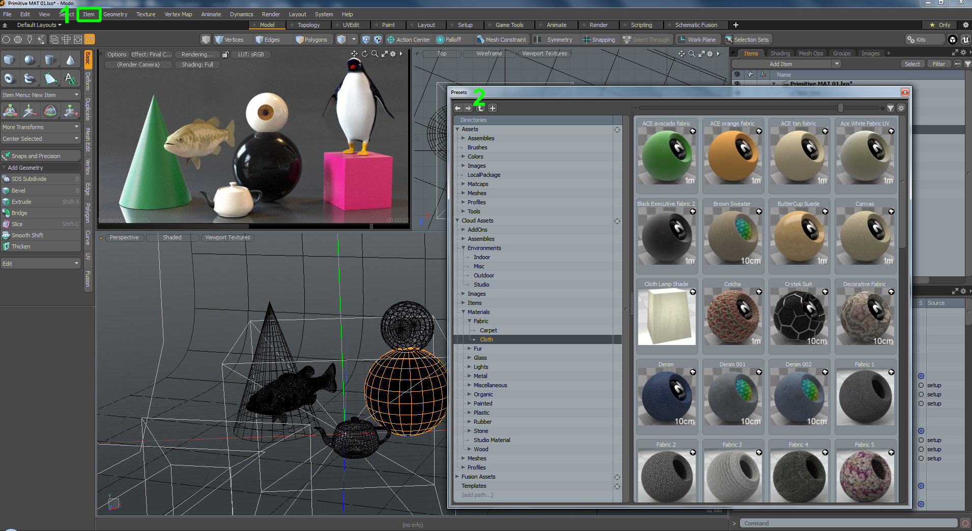 Also Items in den Szenenraum zu bekommen geht klassisch über den Item Pulldown oben (1), oder denselben Pulldown via Rechtsklick in den View