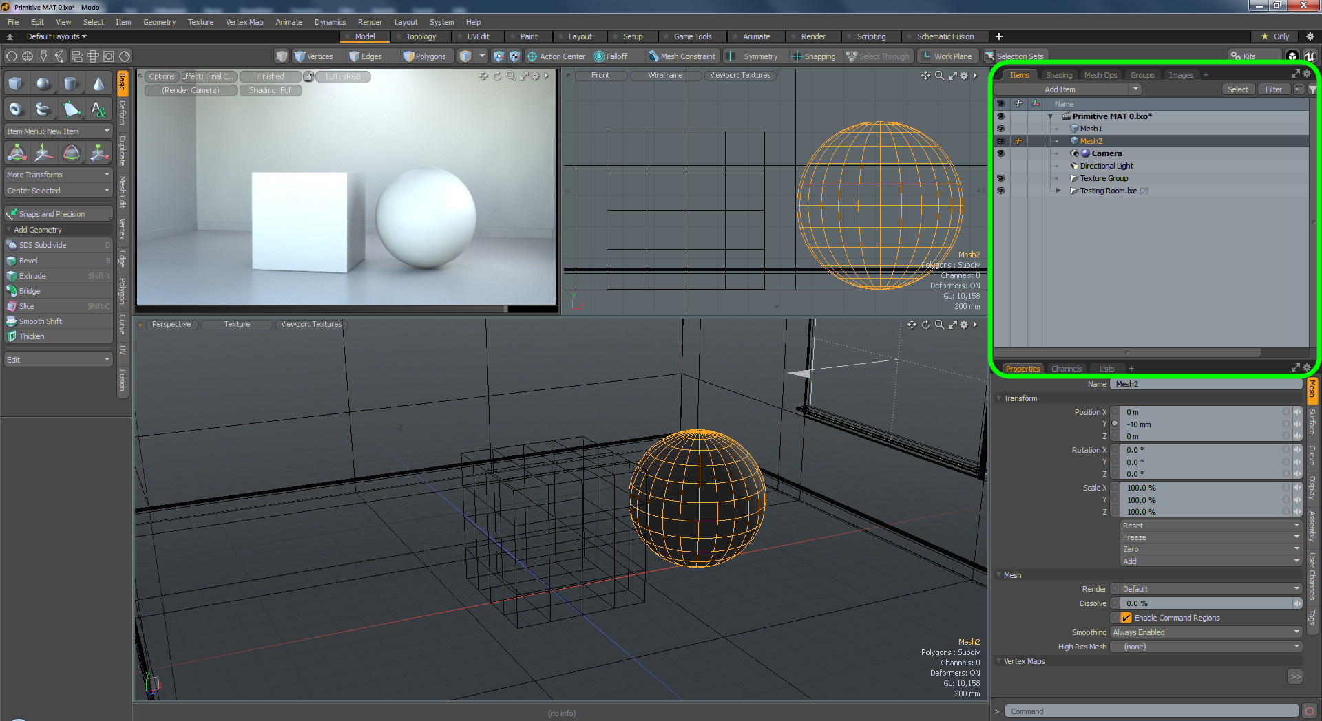 Die Mesh Namen ändere ich natürlich durch in den Namen klicken, in Kugel und Würfel.