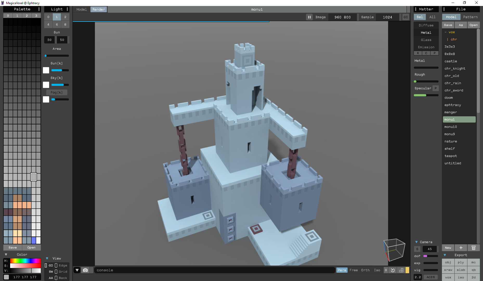 Das Programm ist ein kostenfreier 8-Bit-Voxel-Modeler mit Path-Tracing-Renderer. Und es lädt zum spielen ein, ist recht intuitiv zu bedienen und macht echt Spaß! Ihr könnt die damit erstellen Modelle aber nicht nur mit dem Programm selbst rendern, sondern auch in verschiedenen Formate exportieren und weiterverarbeiten, u.a. als OBJ. Ein kurzer Test eines Exports und anschließenden Imports in Octane Render verlief ohne Probleme:
