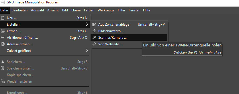 Dann auf die Gimp-Seite geschaut, es scheint zwei Versionen zu geben. Die eine von Ende April - da fehlt TWAIN -