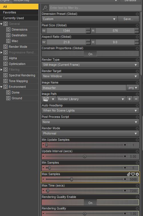 Was mir in deinen Screenshots auch noch auffällt: du hast die Helligkeit des Environments heruntergeschraubt. Weniger Licht bedeutet in Iray normalerweise längere Renderzeiten.