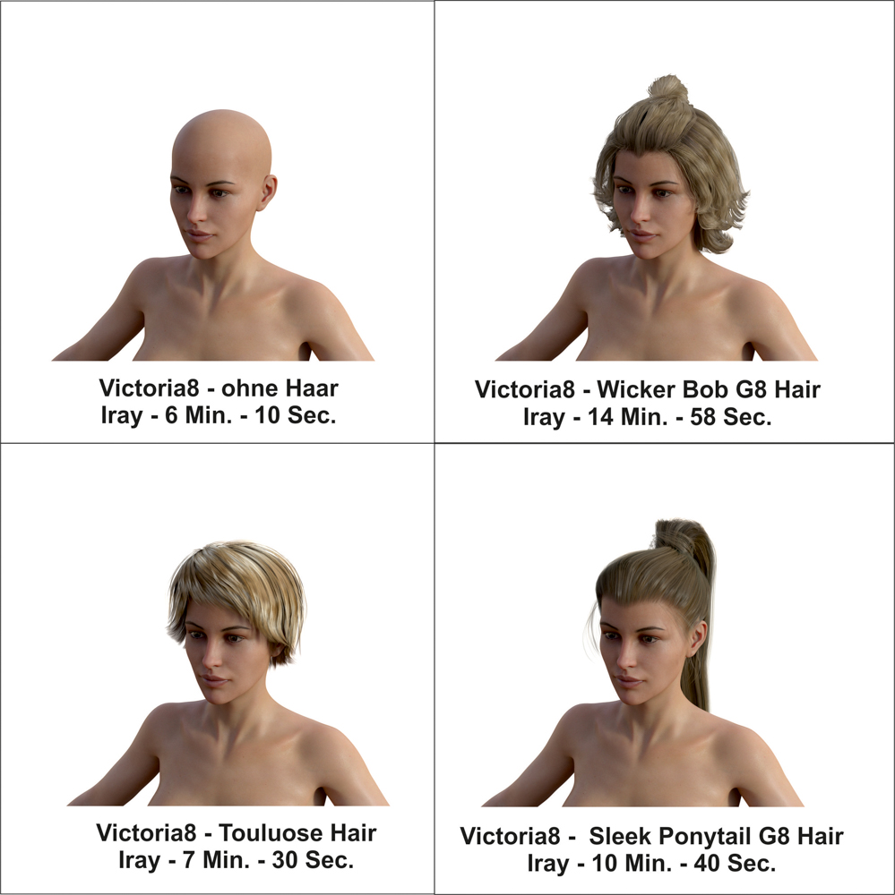 Nein, Spaß beiseite: Ich habe herausgefunden, dass diese "Toulouse-Haare" mit Abstand am schnellsten rund besten rendern. Ich wollte aber immer ein "Pferde-Schwanz-Haar-Set" fürG3 + G8 Female, aber die am Markt verfügbaren rendern nicht gut, brauchen die gefühlte zehn- und zwanzigfache Render-Zeit. Ich hab diese "Sporty-Ponytail-G3 und G8-Haare" und dieses "Zola-Hair-G3+G8". Dehalb meine Frage: Welche Haare, außer diesem Toulouse-Set rendern noch gut? Oder Zusatzfrage: Kann ich noch was an der Einstellungen ändern, außer dem Wechsel von "High Res" zu "Base", was ich immer schon mache?!
