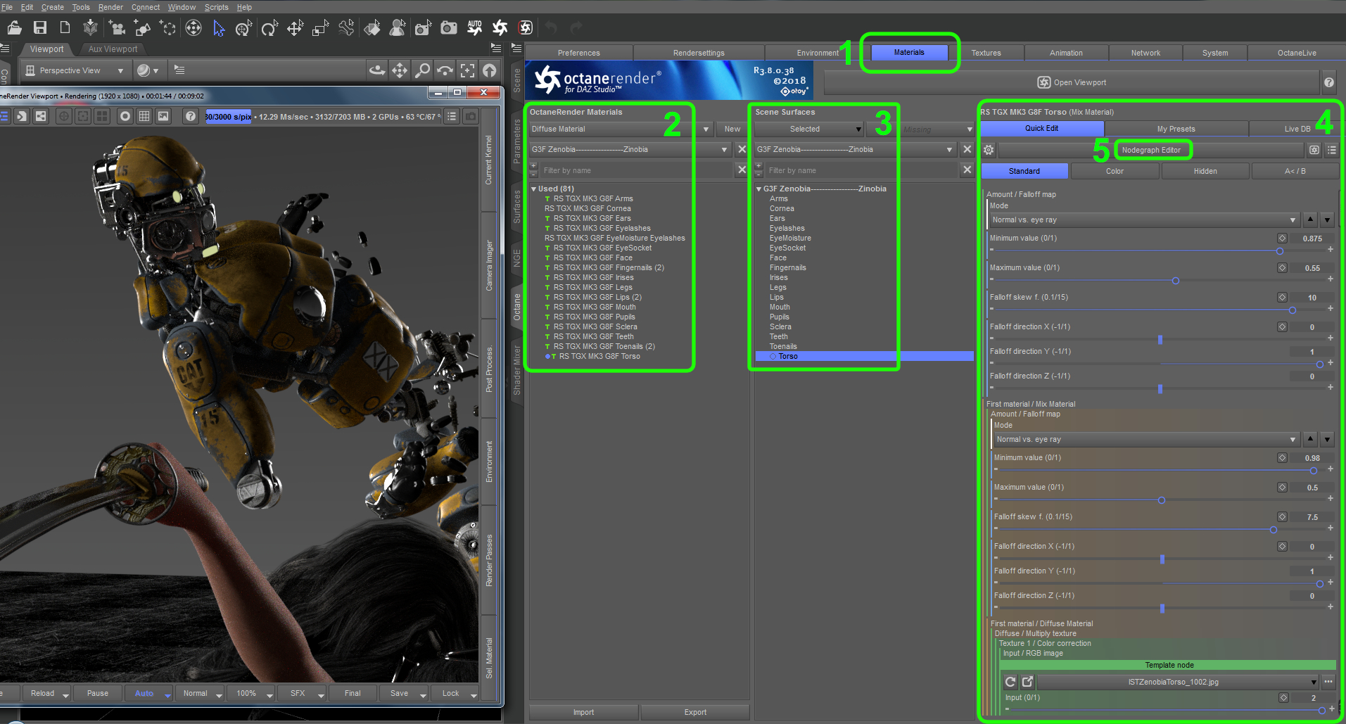 Zunächst wähle ich unter Materials (1) eine Materialzone aus, also den Bereich eines Objektes, den ich oberflächentechnisch bearbeiten will.