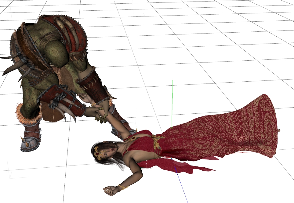• Hi, ich habe heute ein dForce-Problem. Ich habe eine Scene mit 2x G8M und 1x G8FM. G8FM trägt einen dForce-Dress. Sie liegt am Boden, da sie gerade entführt wird. ich möchte, dass der Dress sich um die Beine richtig herumschimiegt, während sie am Boden liegt. Dazu markiere ich den Dress und aktiviere die Simulation.