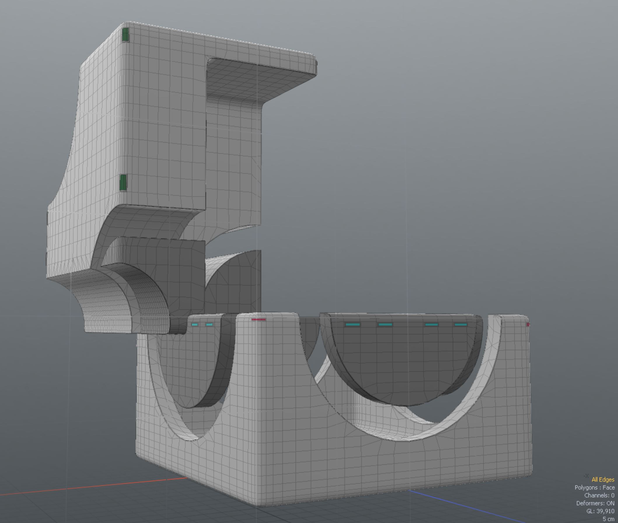 Das ist schon ein abenteuerliches Mesh (Modo_Fusing_Cube-Tubes 045 Position Lights) an den Rändern. Dafür aber erstaunlich artefaktefrei im Render. Es spricht nichts gegen Boolean, wenn es darum geht sich verrückten Formen anzunähern. Aber danach gibt es bei mir entweder eine Runde Retopo oder ich arbeite die Ränder Polygon für Polygon nach um saubere Quads und Face-Loops zu haben.