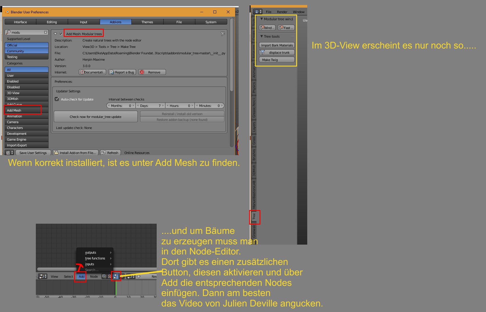 • So, jetzt habe ich noch mal verschiedenes ausprobiert mit dem Ergebnis, dass Modular Tree nach der Installation nicht mehr in der Addon Liste auftaucht. Auch eine komplette Deinstallation von blender inklusive aller Dateien im AppData Ordner kann das Problem nicht lösen. Blender über die Installationsdatei wieder installiert und danach das Adon installiert. Von Blender kommt die Meldung, dass das Adon installiert wurde, aber es taucht nicht auf.