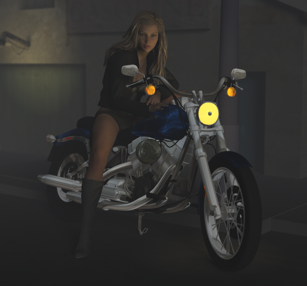 Ansonsten mach die Beleuchtung so, wie sie natürlich sein könnte. Z.B. könntest du die Glühbirne in der Lampe des Motorrads noch leuchten lassen. Bei einem Spot direkt von oben wird nämlich ihr Gesicht ganz schön im Dunkeln liegen, da solltest du entweder eine zweite Leuchtquelle auf ihr Gesicht zu haben, oder das Motorrad eben nicht GENAU unter die Lampe stellen. Oder du nimmst noch ein UberEnvironment Light zu Hilfe, das ist wie der Dome bei IRAY.