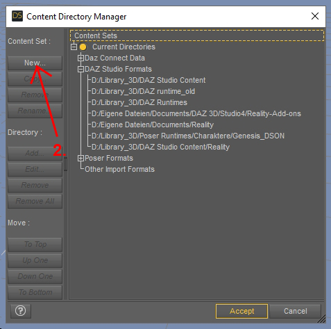 • In DAZ wird mittlerweile unterschieden zwischen DAZ-Content und Poser-Content. Die können ruhig beide im gleichen Ordner liegen, aber Du musst Deinen Contentordner einmal als DAZ-Ordner "anmelden" (egal, wo der sich gerade befindet) und zusätzlich einmal als Poser-Contentordner.