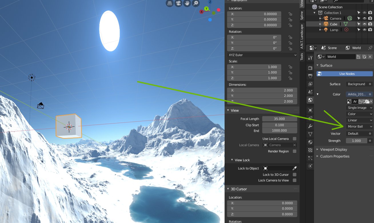 • Doch, der weiße Ball bei Dir am Himmel ist die Sonne, also in diesem HDRI die Hauptlichtquelle. Zu sehen, wenn man Richtung See und nach oben schaut