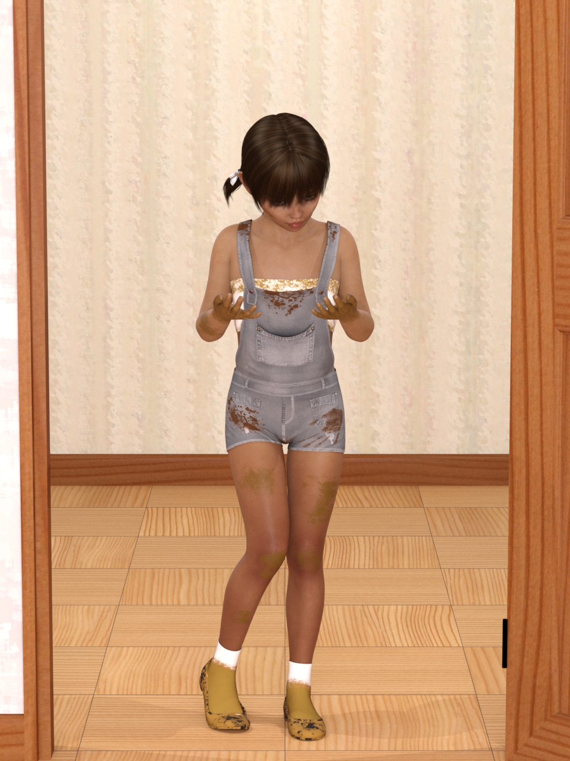 Die Kleine muss auf die Toilette, wagt aber nicht mit ihren total verschmutzten Händen ihre Kleidung anzufassen.