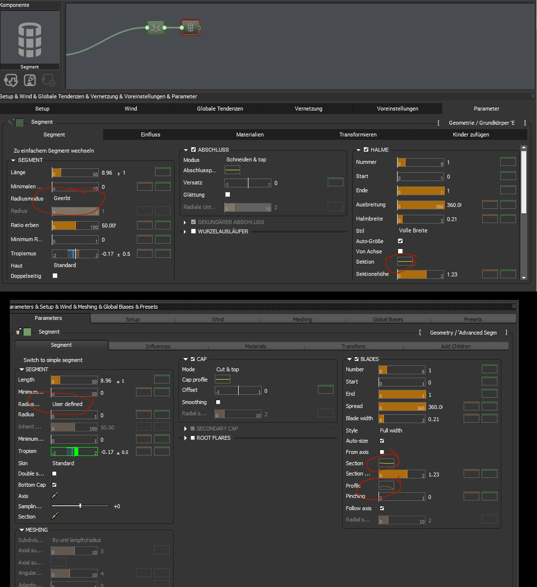 da haben sich zwei kleine Übertragungsfehler eingeschlichen. Der eigentlich Einflussreichste ist, dass Du beim Segment beim Radius "geerbt" hast. Damit gibst du einen fixen Wert von 50% vor der dann beim Segment diese Unschärfe ergibt, denn das Segment ist die mittlere Blattader, wenn Du - wie in diesem Fall - Blades oder Halme definiert hast. Die mittlere Blattader ist bei mir aber unsichtbar, sprich im Radius auf benutzerdefiniert und null gestellt. (siehe screenshot Korrektur 1).
