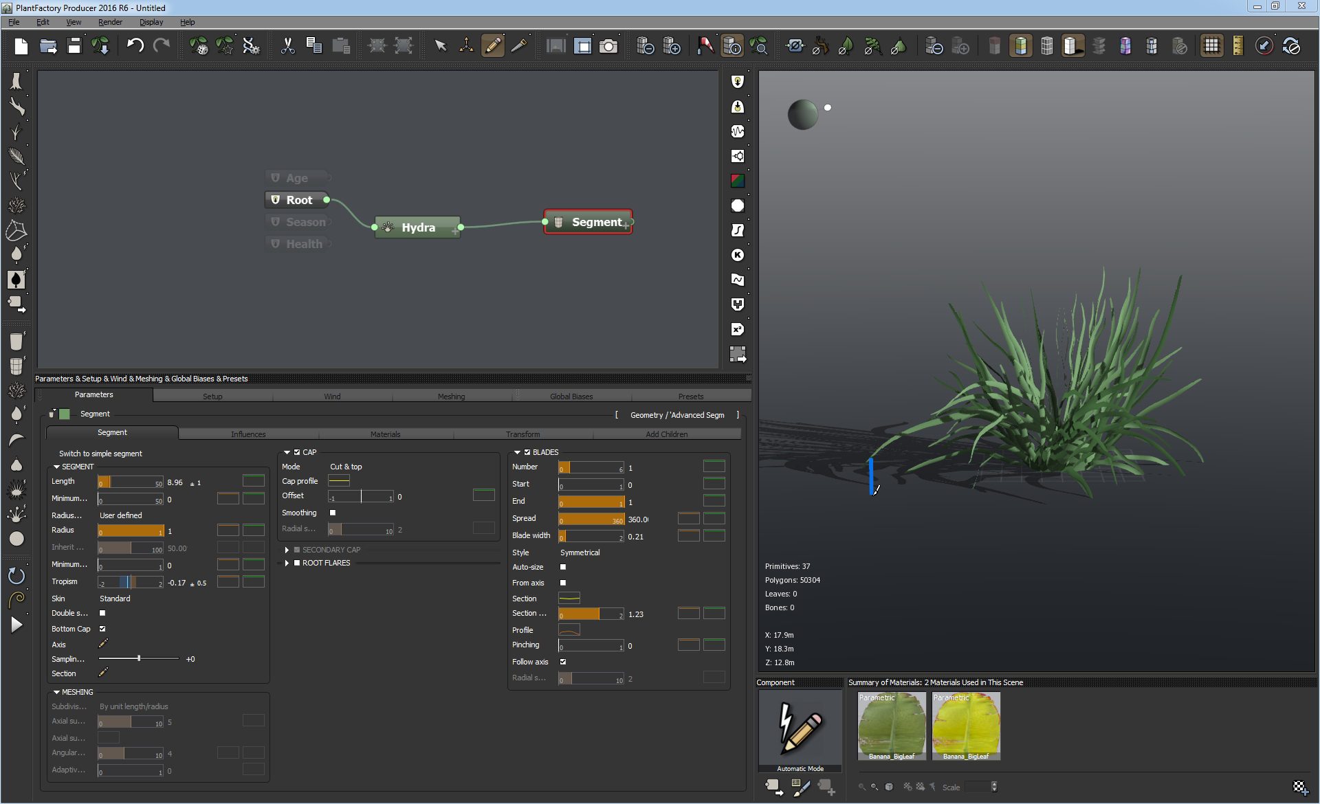 Nur eine Hydra, Anzahl Hydranten erhöht, hier und da rotiert, Spitzen der Halme per Filter auf 0, Textur+Alpha rauf, und mit "alternate Mats" verschiedene Mats im Gras verteilt.