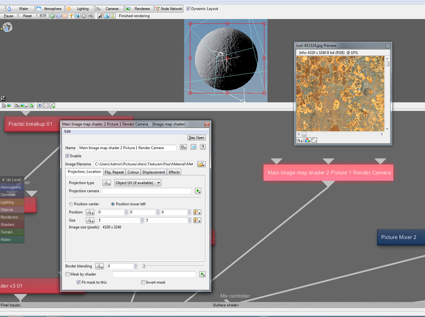 Hier sieht man die Nodes und den Vergleich von dem Rostbild alleine und mit einem Hintergrundbild gemischt.