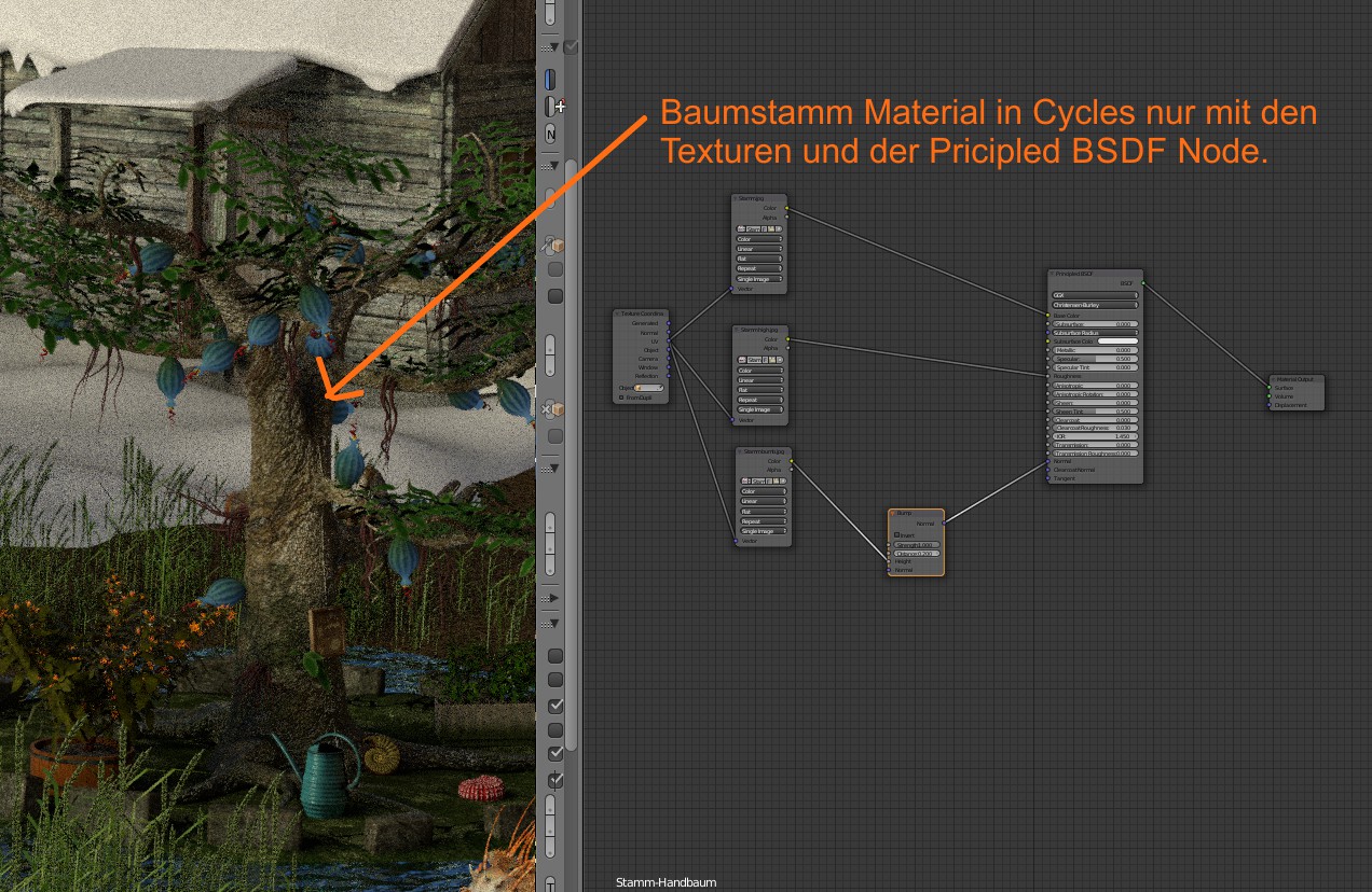 Beispiel eines Baumes von Bommel mit der von mir vereinfachten Node-Struktur mit Hilfe der Principled BSDF Node. Diese Node beeinhaltet alles was man braucht.