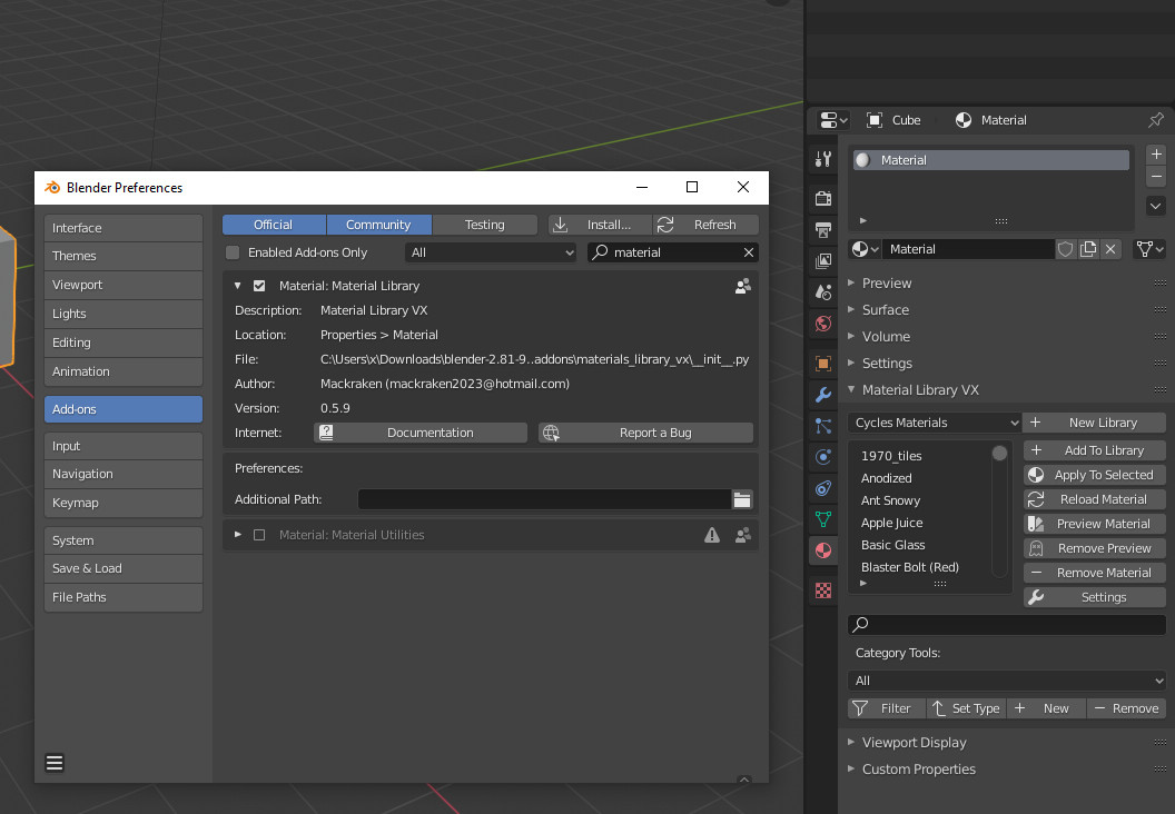 Ferner gibt es ein Addon, das Blender bereits mitgringt und nur aktiviert werden muss. Es nennt sich MaterialLibrary.
