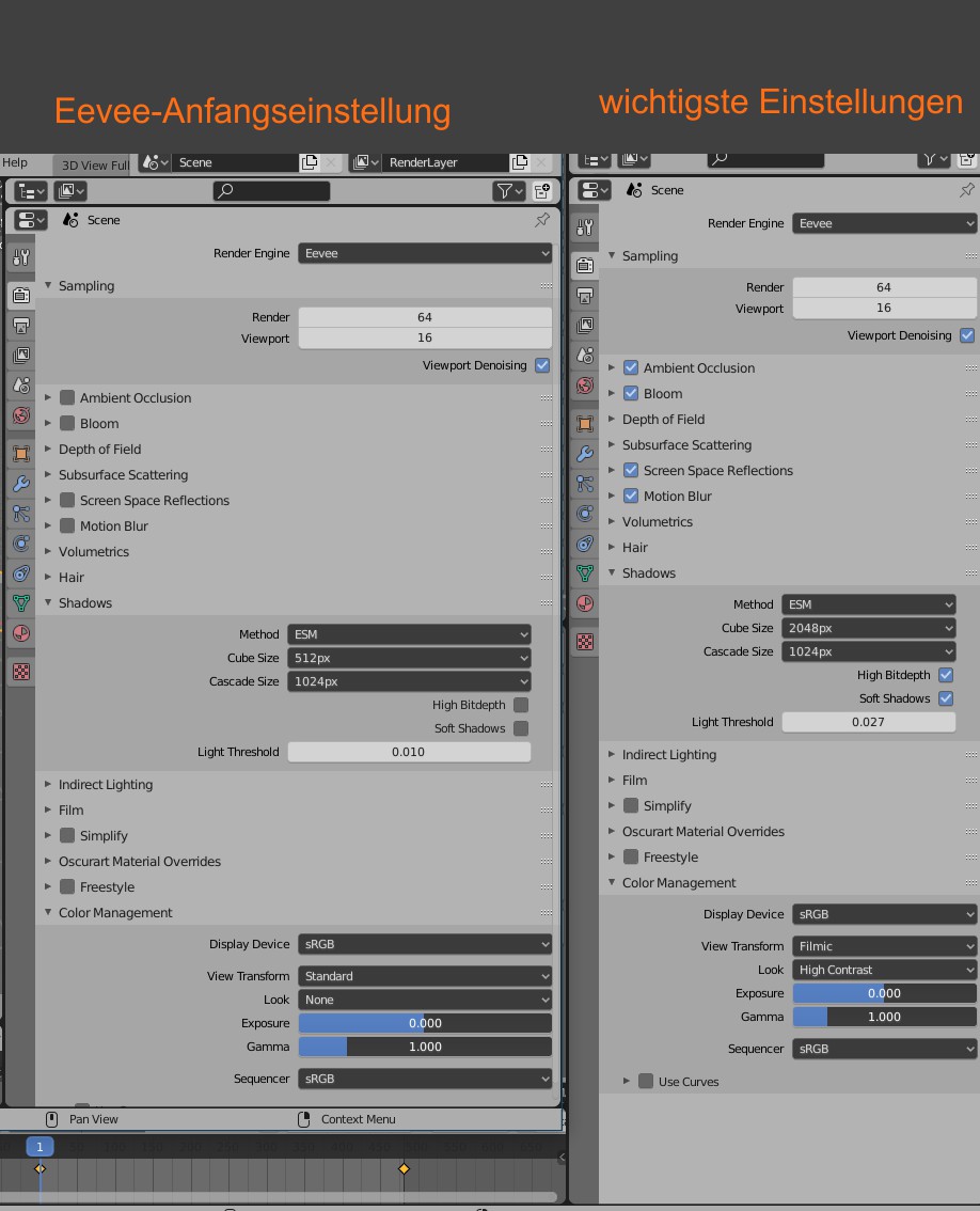 Erstmal Einstellungen für Eevee für den Finalrender. Allerdings ist auch hier immer zu beachten, das unter Ambient Occlussion, Bloom, Motion Blur, Shadow usw. immer noch mehr Feineinstellungen gemacht werden können. Die Standardwerte decken nicht alles ab. Jede Szene ist anders von der Größe, Kamaraentfernung, Licht, Umgebung .......