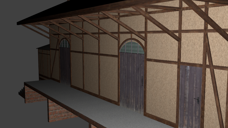 Hier die gleiche Stelle nach dem Backen. Man sieht, dass die Texturen verwaschen sind. Der Grund hierfür ist mir klar. Die Fassade war im Original eine mehrfach gekachelte Textur und die Balken sind um ein vielfaches kleiner skaliert worden .