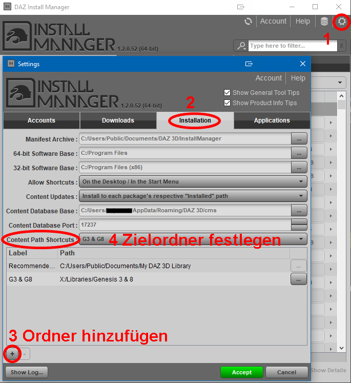 2. Wo und wie ändere ich das Zielverzeichnis für die Installation von DAZ-Content?