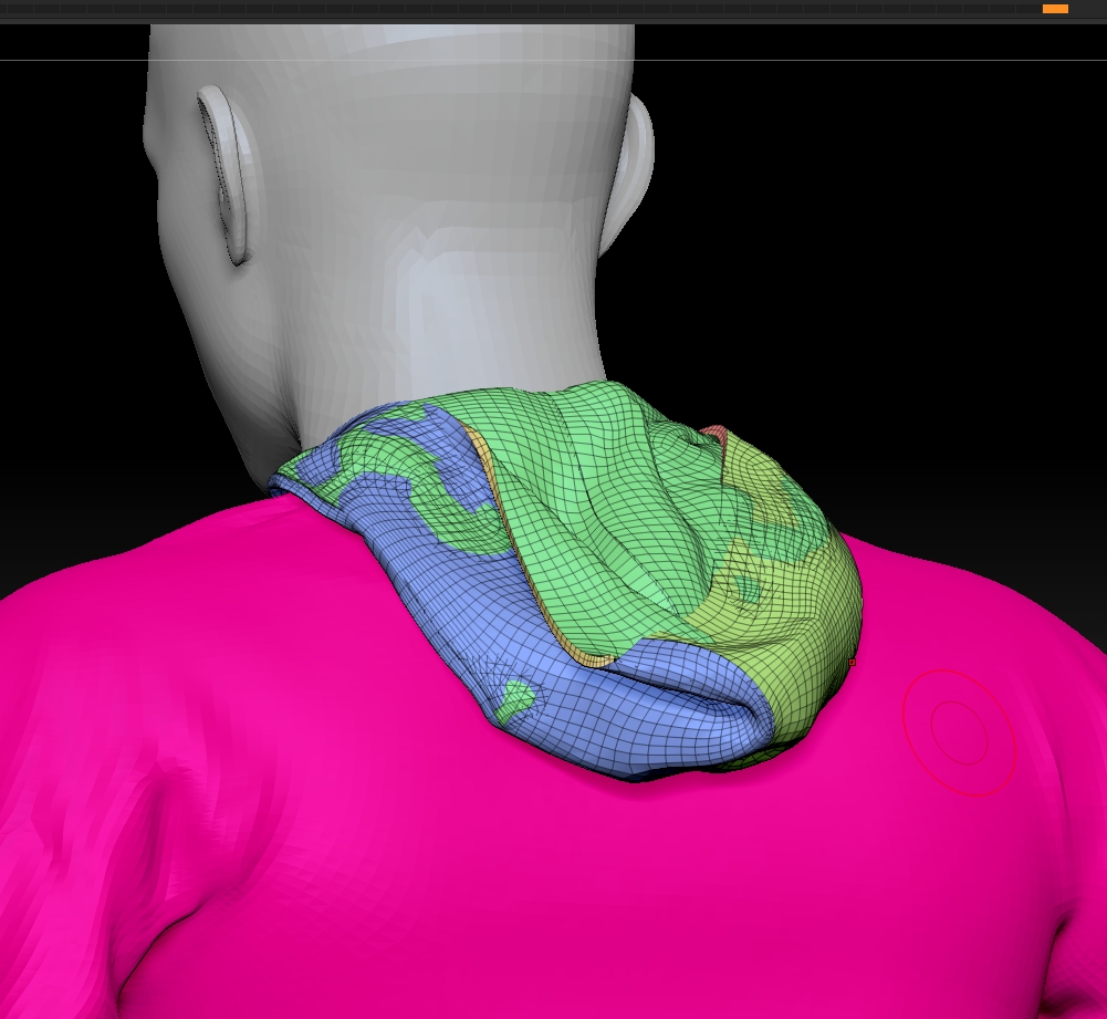 Schon wieder ein Problem, das ich nicht in den Griff kriege: Ein aus Marvelous Designer ohne Dicke exportiertes Sweat-Shirt soll gruppenweise in ZBrush importiert und dort fürs Sculpting vorbereitet werden. Das klappt weitestgehend gut, nur die Mütze macht Schwierigkeiten.