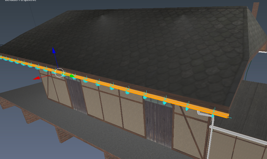 Jetzt bin ich am Texturtieren der Dachrinne. Hierfür habe ich die Dachrinne mit Loop Cut in mehrere kleinere Abschnitte unterteilt und sieht dann (mit aktivierten Normalen zur besseren Darstellung) so aus:
