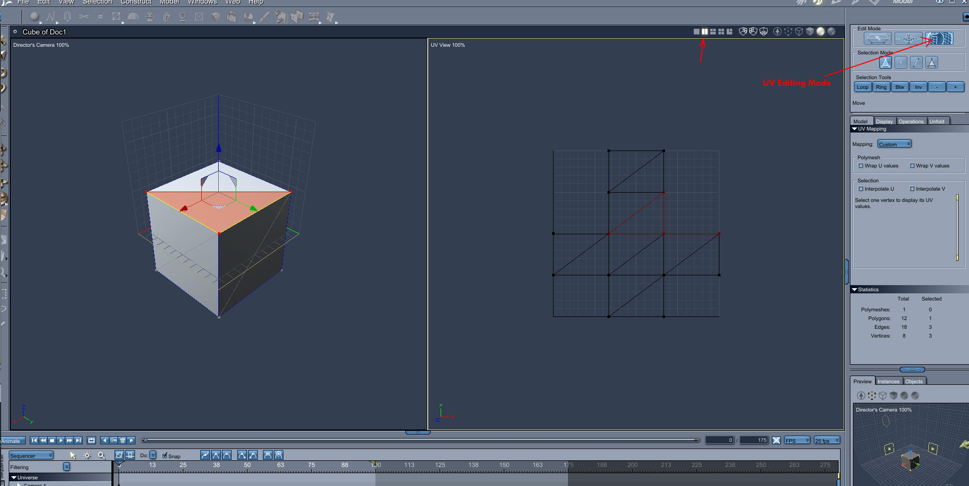links ist das Objekt und rechts im kleinen Fenster die UV-Auflösung.