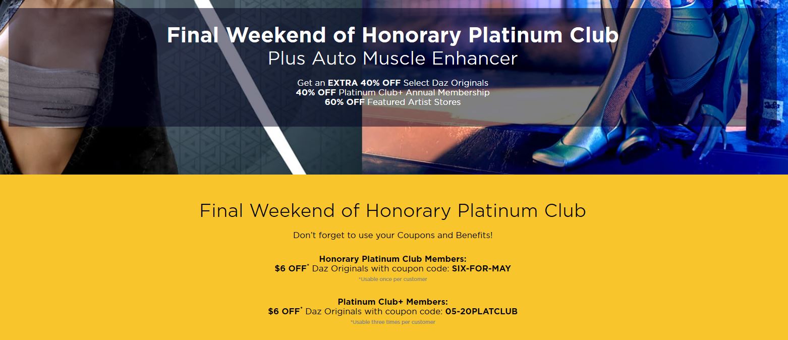 An diesem Wochenende gibt es noch einmal die "Honorary Platinum Club"-Mitgliedschaft für jeden! Und da wir gerade einen neuen Monat haben, können alle mit dem entsprechenden Coupon-Code für 6$ bzw. sogar für 3*6$ (für diejeningen, die ohnehin Mitglied im PC+-Club sind) DAZ-Originale einkaufen. In der Liste sind über 1200 Teile - sortiert nach Preis und schaut, was Ihr für unter 6$ bekommt, dann zahlt Ihr nix ![]()