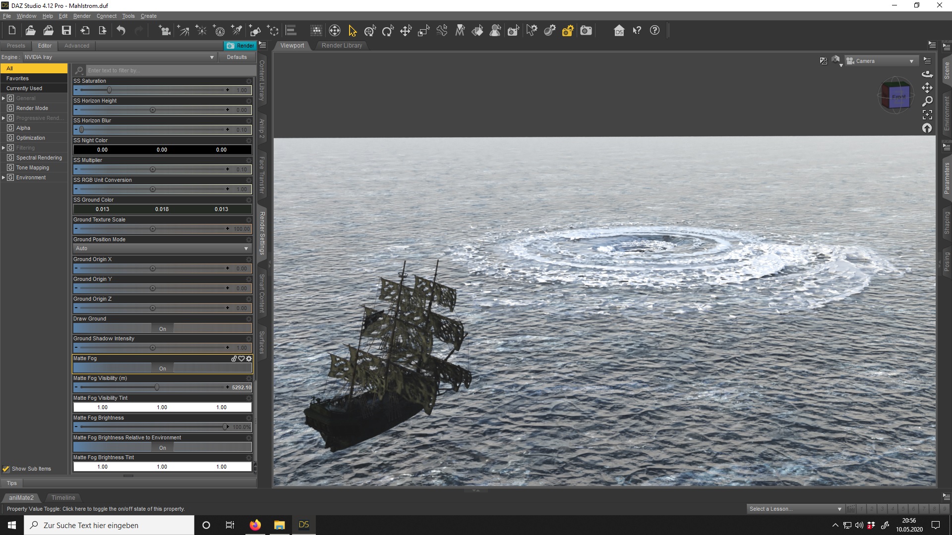 Nun suche in meinen Smartcontent Iray STORM heraus und nehme einen Lightning Prop für nen ordentlichen Blitz in der Mitte des Mahlstromes und noch einen Regen Propsetting ,denn ich haber auf LOW gestellt habe,weil man überhaupt nichts mehr vor lauter Waschküche den Hintergrund sehen konnte(meinen schönen gezeichneten Background soll man doch sehen* heul*) und auch so ein bischen das Regensystem runtergedimmt die Opacity Map