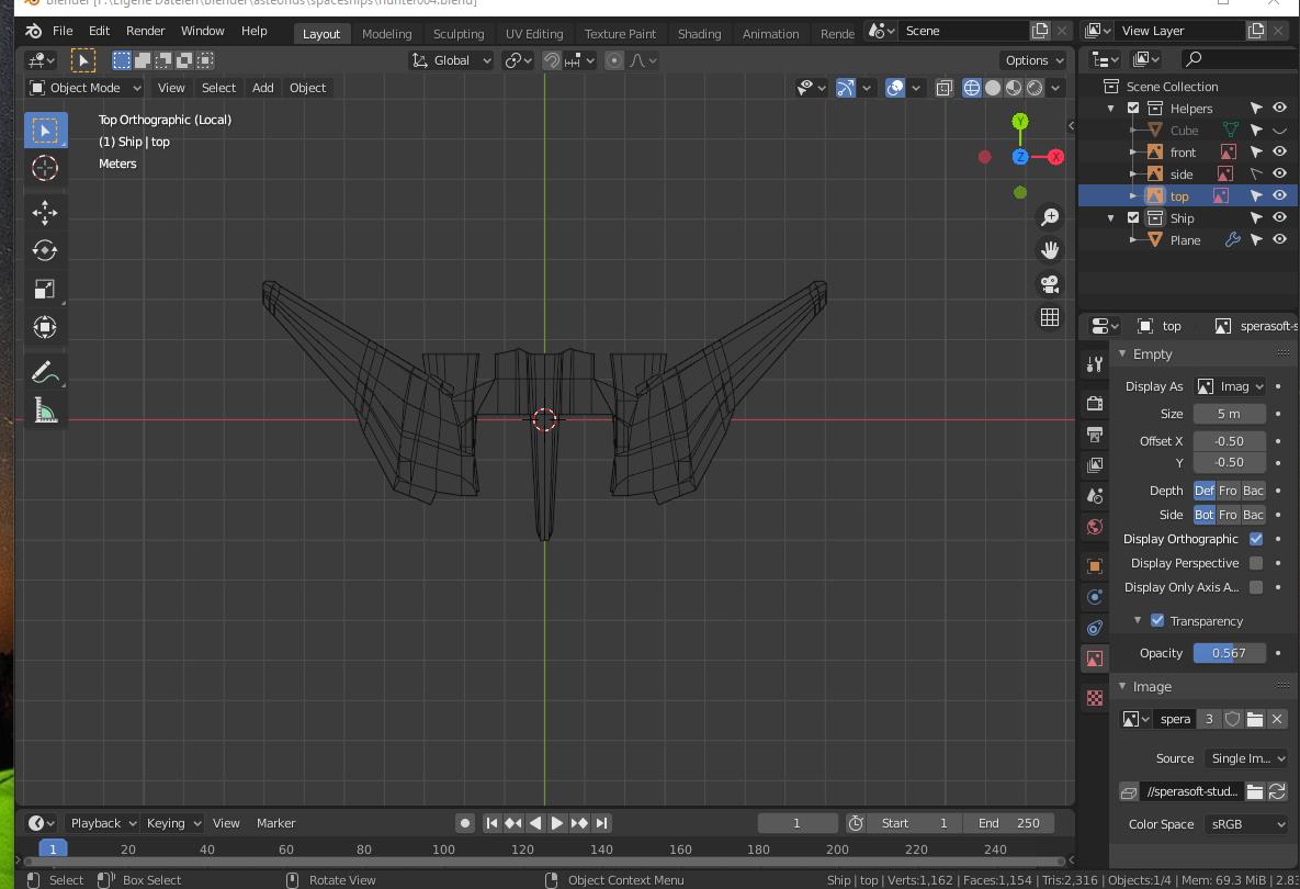 Was ich eben erst festgestellt habe: wenn ich im Object Mode die Taste 2 (nicht im Zahlenblock) drücke, ist das Reference Bild auch in der Modeling Ansicht nicht mehr sichtbar. Nochmal drücken hilft nichts, da geht nur rückgängig .