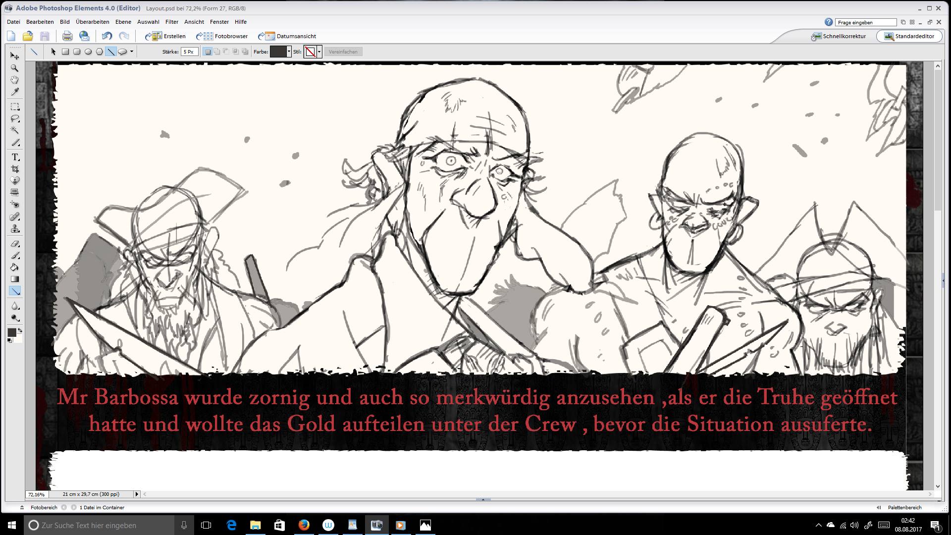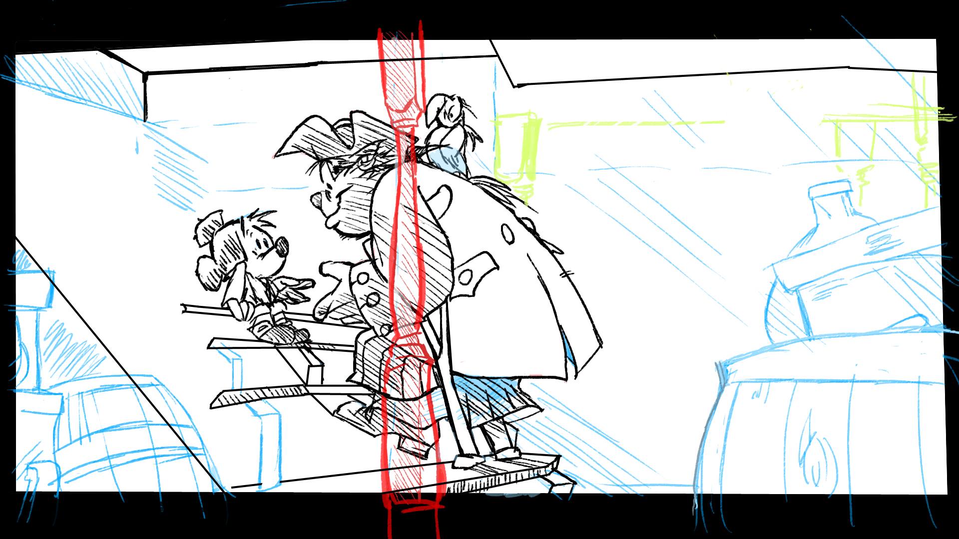 Zunächst liegt man eine grobe rohe Skizze ,wo ungefähr die Figuren und Sprechblasen hinkommen müssen ,um nicht den Hintergrund zu viel zu stören oder auch um die Gesamtlesekomposiotion aufzubauen.