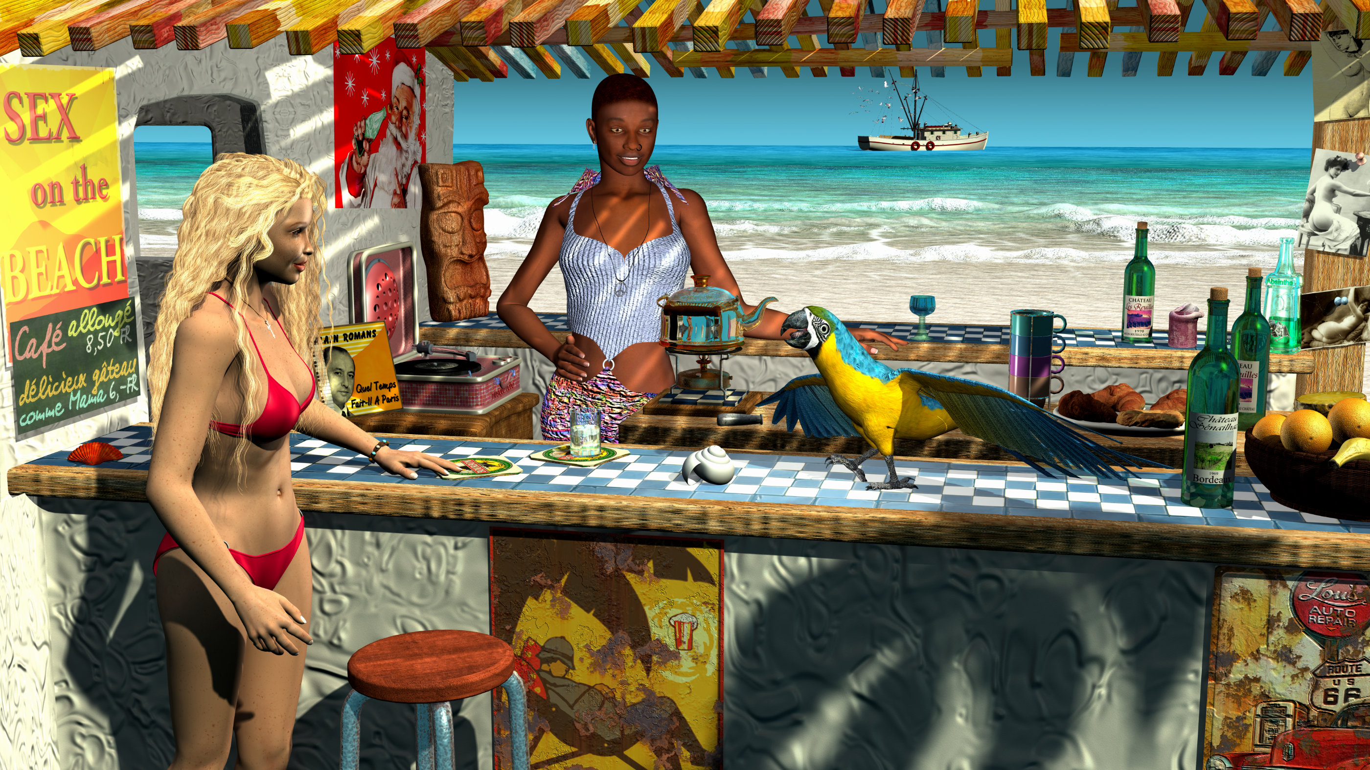 Was mir an der technischen Ausführung sofort ins Auge springt ist, der Papagei hat kein tolles Gefieder, die Holzlatten der Bedachung sind zu glatt , die Haut von Melanie glänzt mehr nach Plastik und auch hier wäre etwas Struktur durchaus hilfreich. Wenn man keine Bumb-Map hat für ein Objekt, dann tut es auch manchmal die Diffuse-Map. Einfach in den Bumb-Kanal stecken (der macht daraus dann automatisch eine Graustufenmap) und mit ganz kleinen Werten testen. In C kann man ja auch Minuswerte eingeben um die Map notfalls zu invertieren. Das würde zumindest dem Papagei und den Holzlatten ein wenig gut tun. Bei der Haut könnte es schwierig werden. Vielleicht hier den Glanz etwas zurücknehmen. Die Muschel liegt etwas unglücklich. Im ersten Moment meinte ich sie schwebt. Ich habe es mal dem Papagei in die "Schuhe" geschoben, weil er so mit dem Flügeln rummacht. ;) .