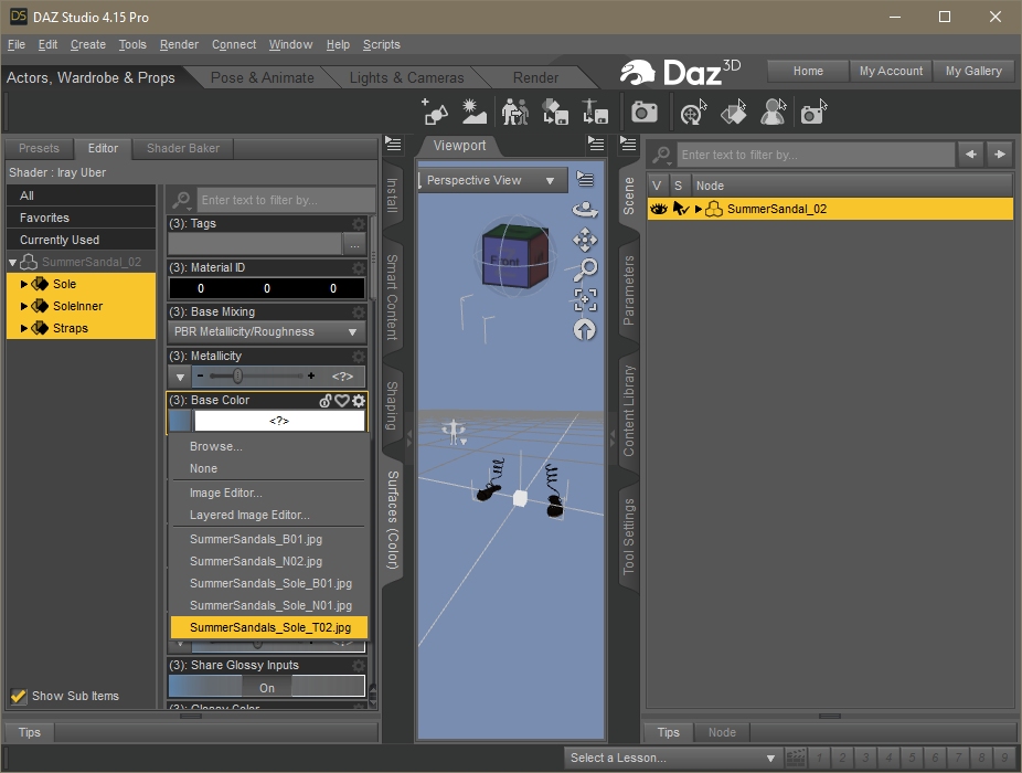 Laut Screenshot öffnest Du eine neue Szene, in der sich die Sandalen befinden. Was Du aber eigentlich benötigst, ist, dass Du die Sandalen aus deinem Content lädst. Was sind das für sandalen, für welche Figur sind die ursprünglich?