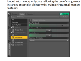The Iray render engine has an optimization option that it is veryimportant to be aware of. It is called ‘Instancing Optimization’and can be set to one of two settings: ‘Speed’ or ‘Memory’. Whenrendering a large number of instances ensure that this option isset to ‘Memory’.The ‘Speed’ setting instructs the renderer to load every instanceas full geometry into memory at render time. This can potentiallyspeed up a render containing only a few instances but if theinstances are of complex objects or there are many thousandsof instances then it is easy to overwhelm the system and cause acrash.The ‘Memory’ setting ensures that each object that is instanced isloaded into memory only once - allowing the use of many, manyinstances or complex objects whilst maintaining a small memoryfootprint.