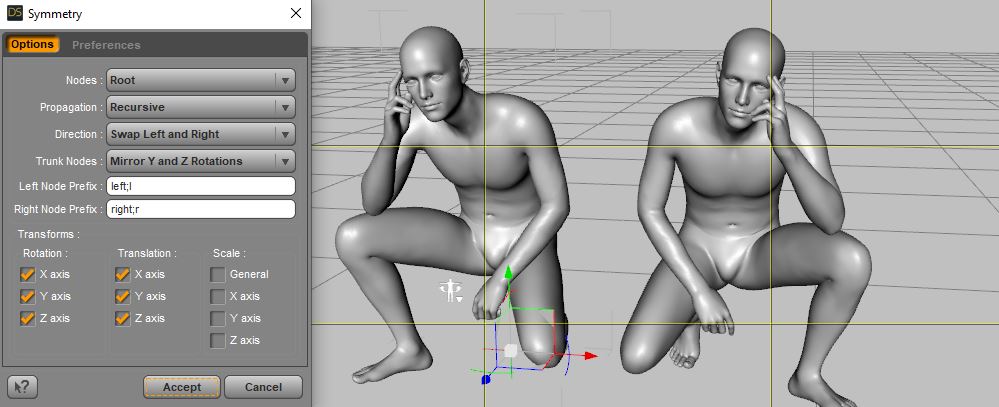 Daz ist nun mal kein Bildbearbeitungsprogramm. Es gibt die Möglichkeit, Posen zu spiegeln, indem man SHIFT+Y drückt, oder Dinge zu spiegeln, indem man die X-Scale auf -100% setzt.