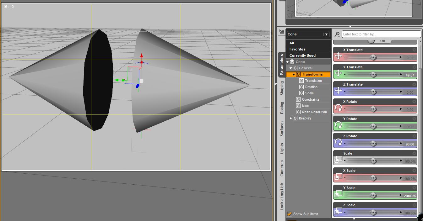 Du markierst Dein Objekt, wechselst ins Parameter-Pane und änderst dort im Bereich Scale das Vorzeichen bei Deiner Spiegelachse. In meinem Beispiel war das eben die Y-Achse, die ich von 100% auf -100% gestellt habe.