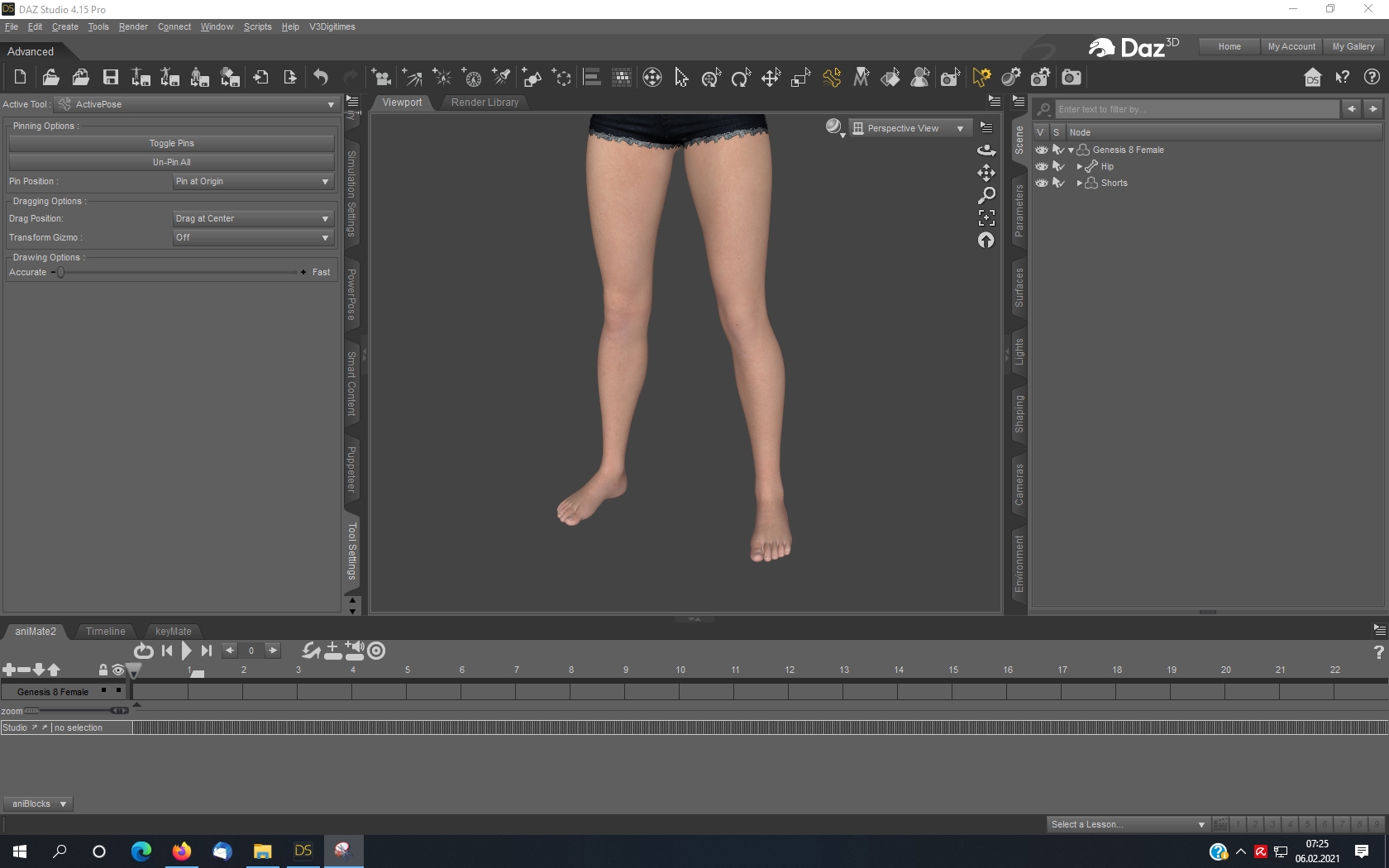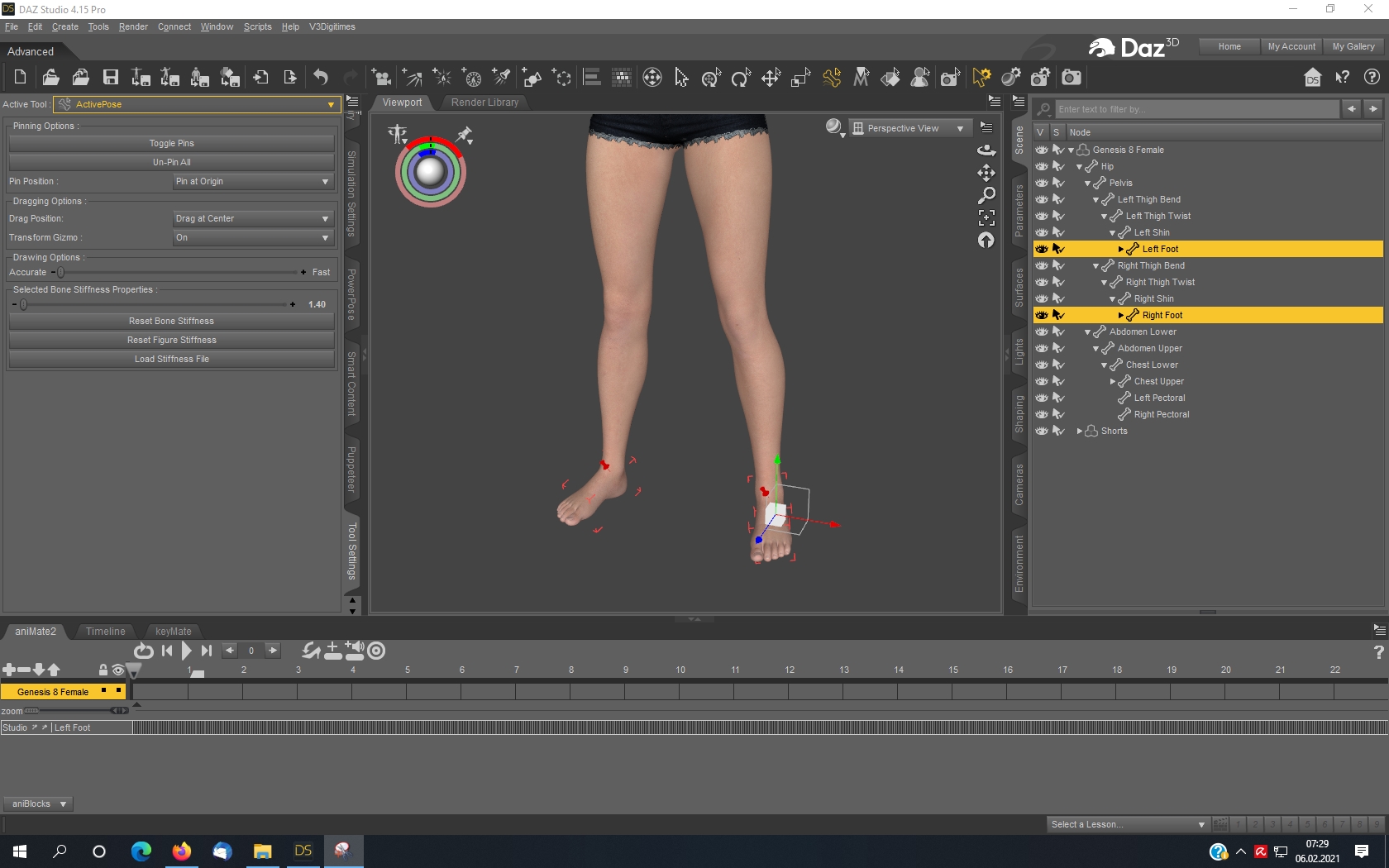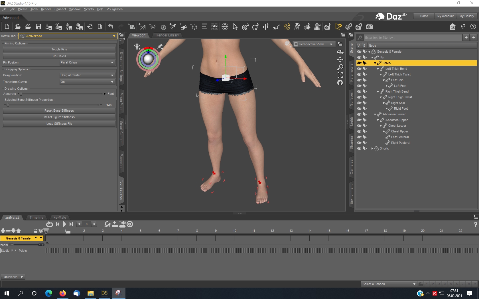 5. Die Füße sind nun fest genagelt und Du kannst z.B. den Pelvis anklicken und ihn in Position ziehen! Evtl. mußt Du vorher im Parameter Fenster auf "Hip" klicken die Limits auf "off" stellen.
