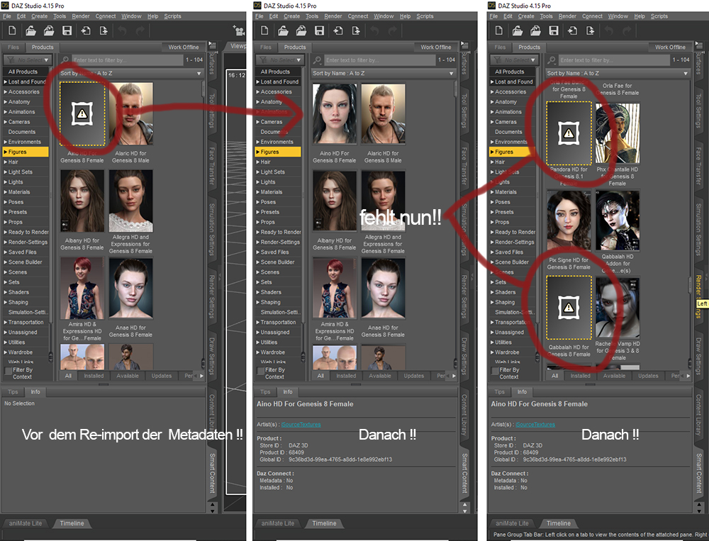 Jedenfalls habe ich versucht als Maßnahme die Metadaten zu Re-importen. Dies funktioniert im ersten Moment auch, aber bei Kontrolle stellt sich herraus das dafür andere Vorschaubilder fehlen die zuvor noch da waren. Spannend wird es dann wenn ich DAZ neu starte denn danach ist wieder alles wie vorher und der neue Content ist wieder nicht dargestellt dafür der alte wiederrum wieder da.