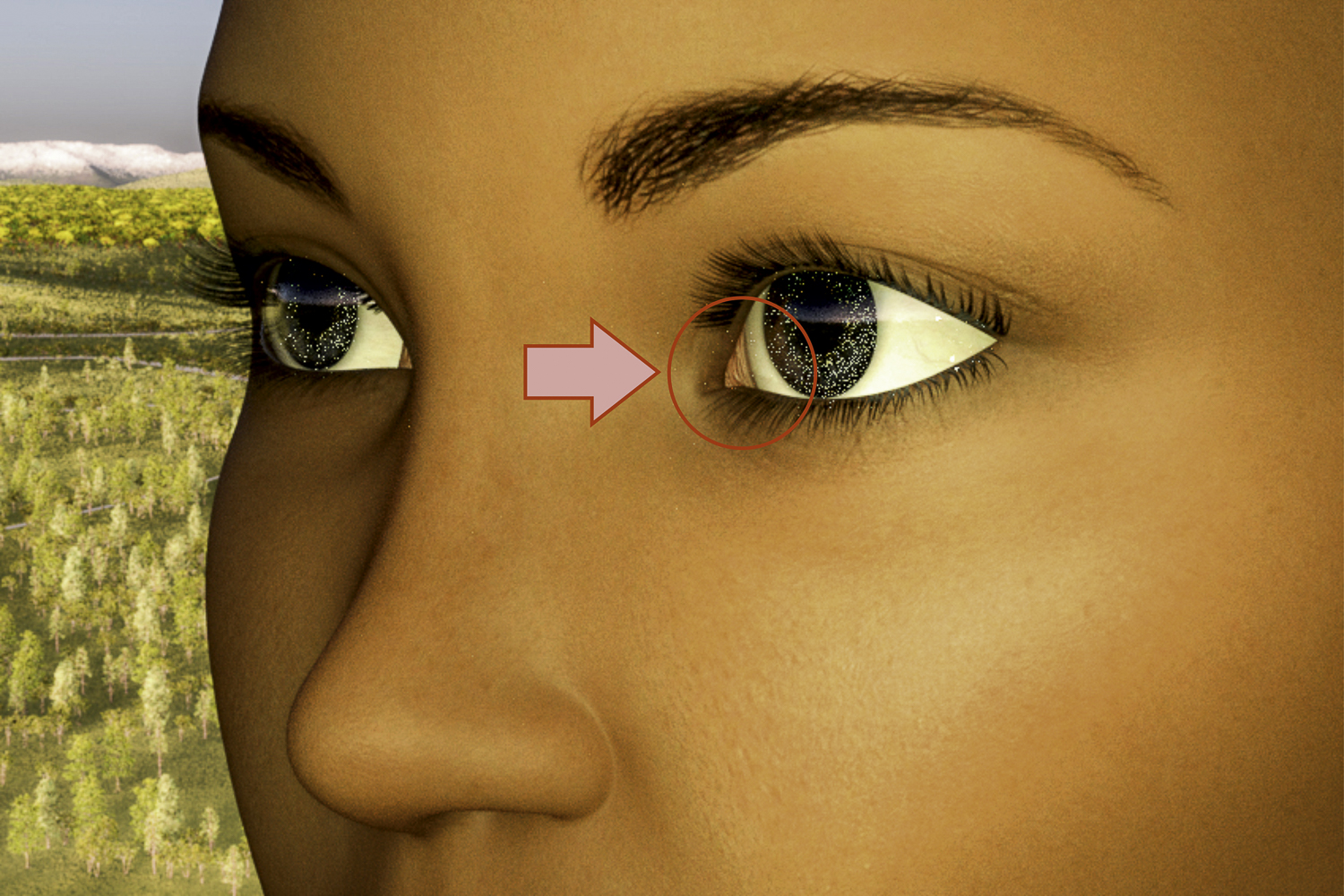 Bild 1. Original G8.1 - wie man sieht liegt die Tränenflüssigkeit genau am Auge an, der Ausgangsbereich des Tränenkanals ist hier weis weil er von der Tränenflüssigkeit überdeckt wird (Bild ist im Vorschaumodus)