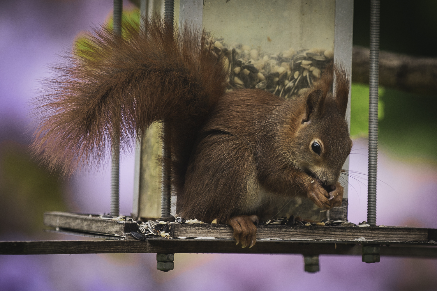 Eichhörnchen hab ich hier noch keine gesehen, aber dass der Buntspecht sich was aus dem Futterhäuschen holt, kommt öfters vor