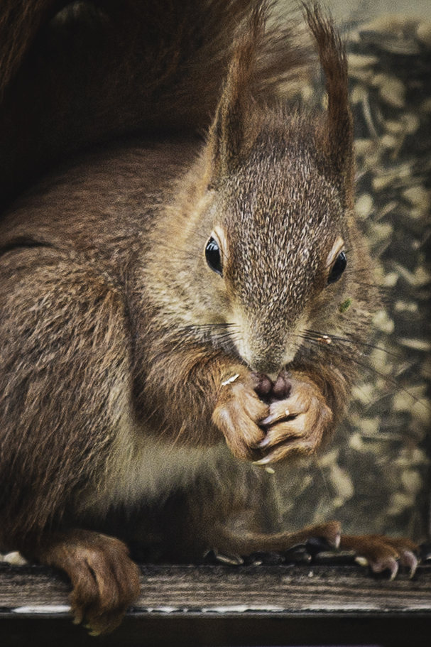Eichhörnchen hab ich hier noch keine gesehen, aber dass der Buntspecht sich was aus dem Futterhäuschen holt, kommt öfters vor