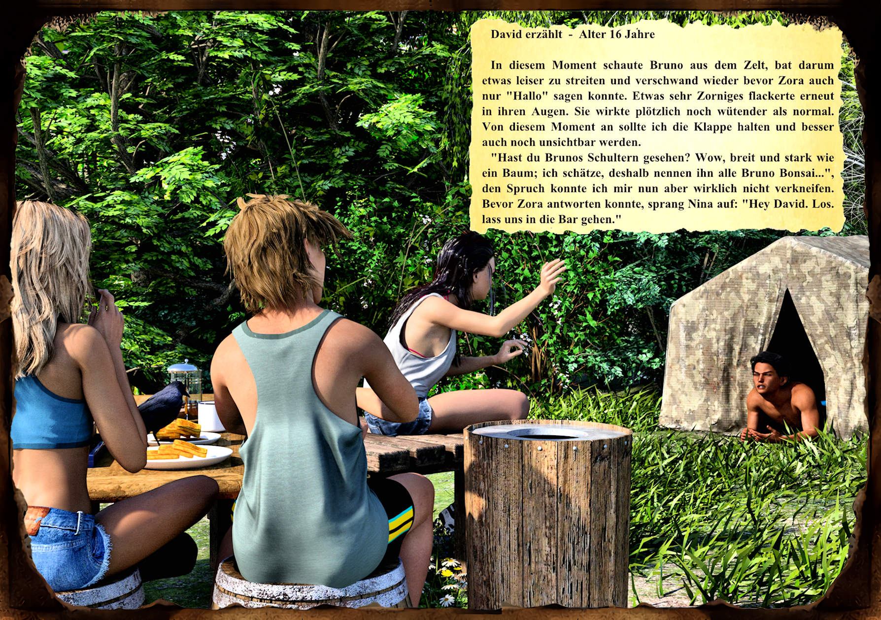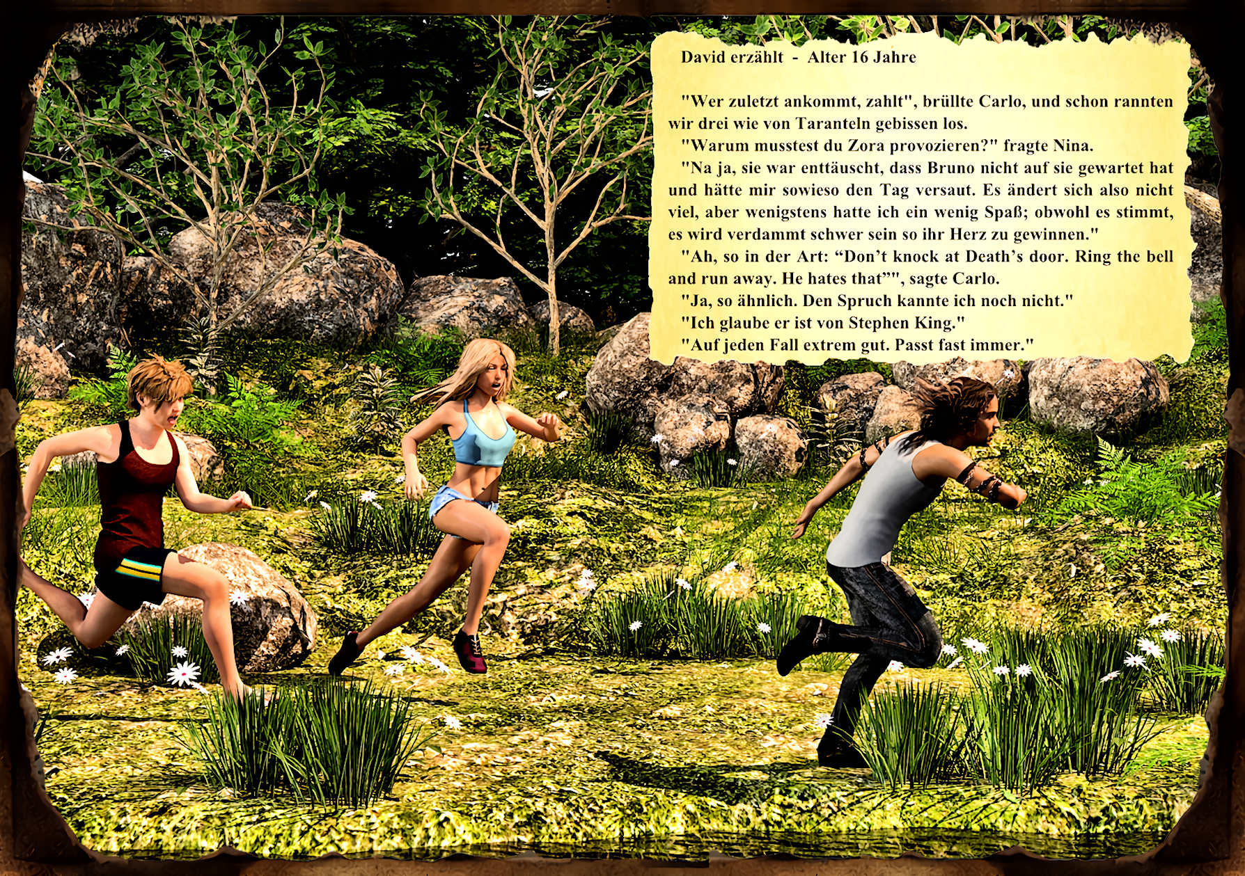 Ich finde es schön gemacht, wobei es auch keine Rolle spielt, mit welchen CGI-Programmen Du die Bilder erstellt hast. Würde ich die Story aber nur von den Bildern kennen, dann würde ich nach der Storyline und den Spannungsbögen fragen, denn ich sehe da erstrangig zwei Kids, die in irgendwelchen Tümpeln planschen und einen Protagonisten, der dauerhaft lädiert zu sein scheint. So frage ich mich: Wie tickt das Mädel, da sie sich für ein scheinbares "Opfer" mehr zu interessieren scheint als für den Macho, der den Jungen verprügelt hat. Und das wäre z.B. ein Cliffhanger oder zumindest ein Sog, wenn die Story aus ihrer Sicht geschrieben wäre.