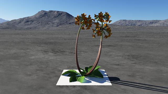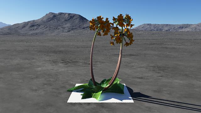 Schon besser, aber noch nicht ganz richtig, vor allem, was die unteren grünen Blätter betrifft. Nun das Objekt kurz in Blender importiert, markiert und wieder exportiert, es scheint beinahe annehmbar zu sein. Das vordere grüne Blatt ist in Blender ganz zu sehen, möglicherweise ist es hier im Boden versunken, von Gartenerde bedeckt, oder was auch immer. Doch die Blätter sehen nach Blätter aus.