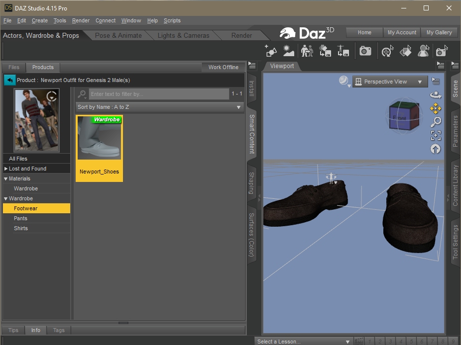 Ich habe das einzige Paar Halbschuhe gefunden unter newsport_shoes. Nun habe ich sogar herausgefunden wie ich Posen einer bekleideten Figur zuweisen kann und die Kleider sich korrekt mitbewegen. Mein betagter Rechner geht zwar ganz schön in die Knie, aber es funktioniert ohne Abstürze. Auch wenn es eine halbe Ewigkeit dauert. Das war ein grosses Aha Erlebnis ;)