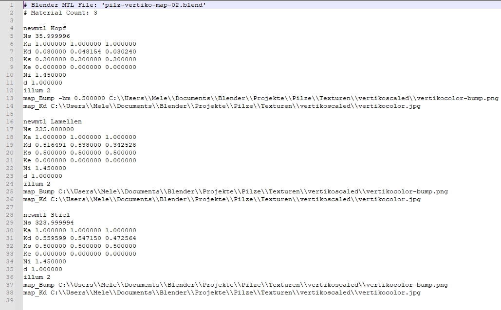 Was mir beim Export von Objekten auffiel, nur bei einer Verknüpfung über "Normal Map" wird die Bump Map von Blender in die MTL geschrieben. Bei Verwendung von "Add → Vector → Bump oder Displacement" erfolgt kein Eintrag von map_Bump in der MTL, mit "Add → Vector → Normal Map" hingegen wird die map_Bump in der MTL eingetragen. Ist mir aber erst aufgefallen, nachdem ich mir ein fertig vorhandenes Objekt anschaute. Da schaute ich nach, nach dem es bei mir anfänglich nicht mit dem Eintrag funktionierte. OBJ nicht von mir: